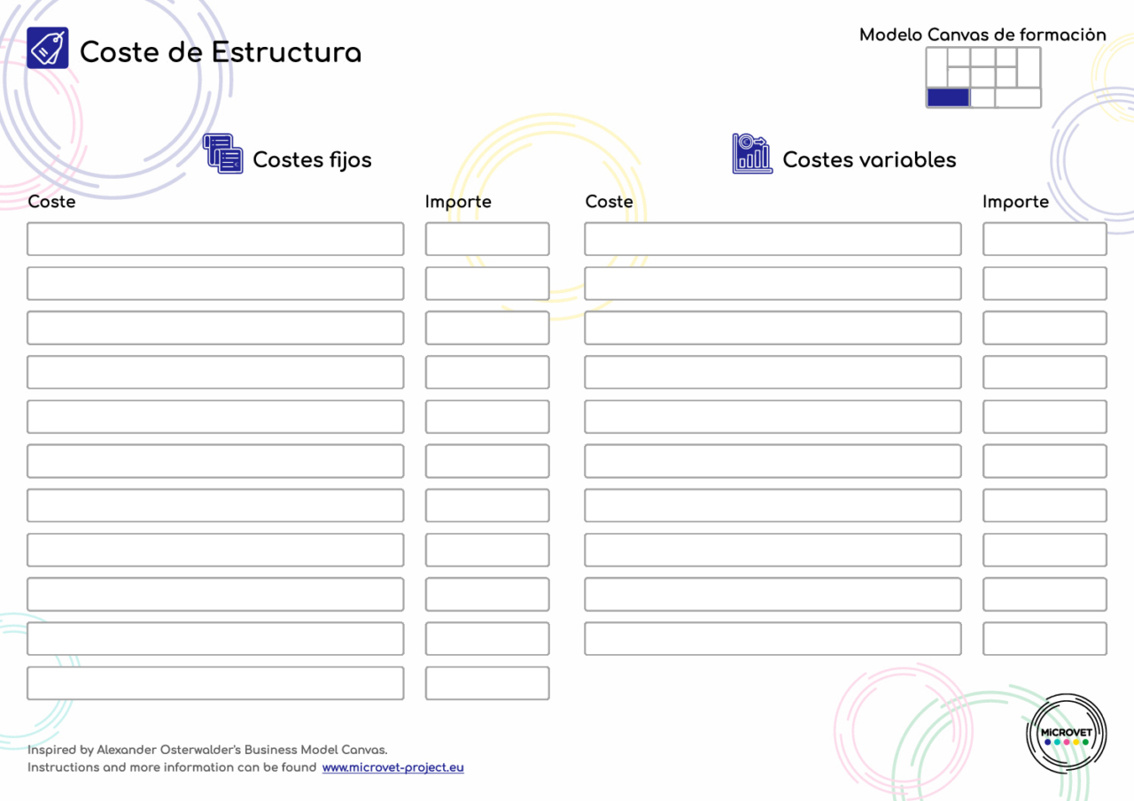Los costes se dividen en dos categorías principales: costes fijos y costes variables. Para cada coste también registrarás el importe para tener una idea clara de los gastos generales del programa.