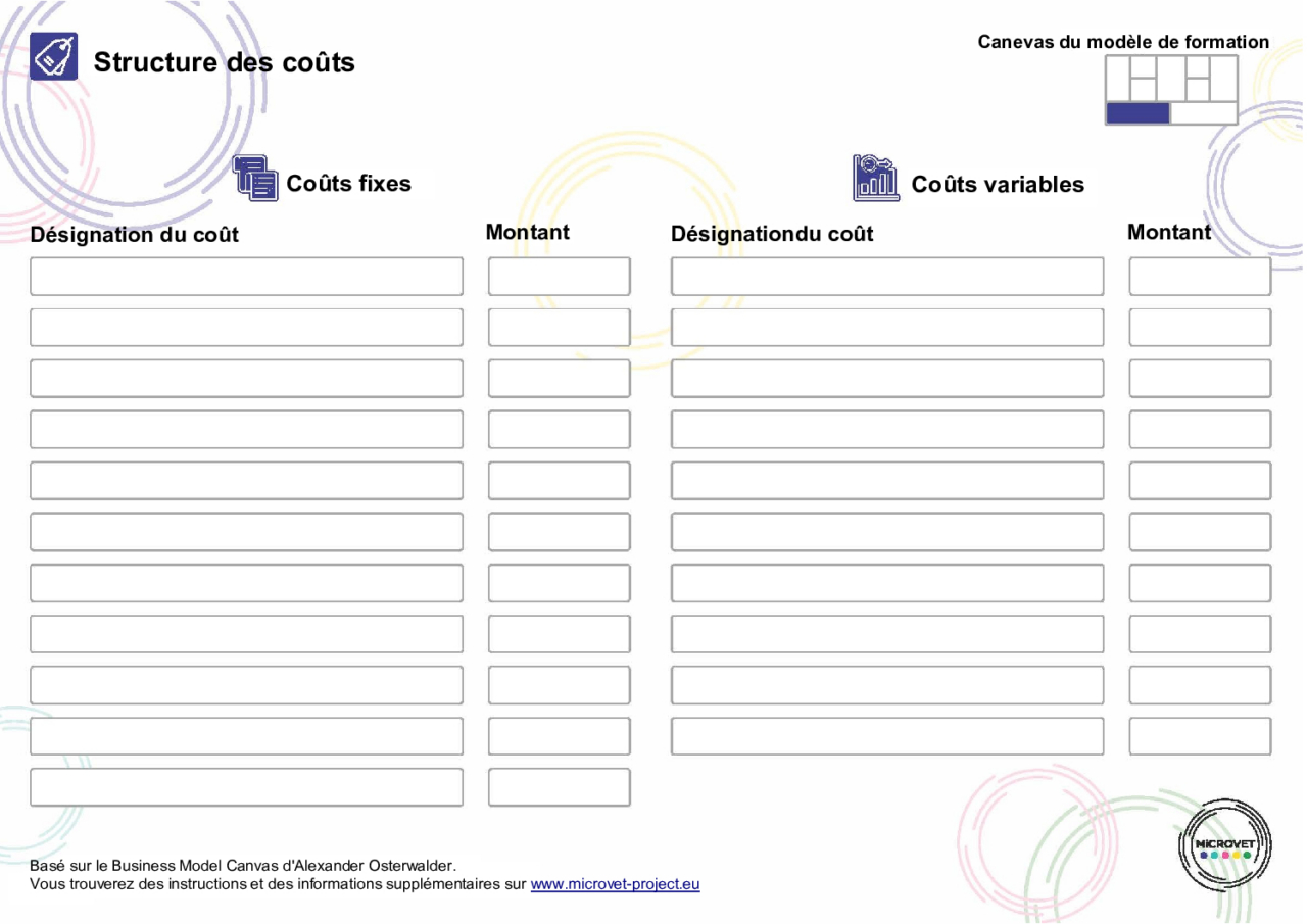 La fiche de travail sur la structure des coûts est conçue pour vous aider à identifier et organiser clairement les coûts impliqués dans la gestion de votre programme de micro-certification. Cela est essentiel pour l’établissement du budget, la fixation des frais et la garantie de la viabilité financière.