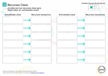 Para cada actividad clave enumerada, añada los recursos necesarios para completar esa actividad en el cuadro de recursos necesarios situado junto a ella. Los recursos pueden incluir personal (por ejemplo, expertos en la materia, diseñadores instruccionales), tecnologías (por ejemplo, sistemas de gestión del aprendizaje, software), financiación o materiales físicos.
