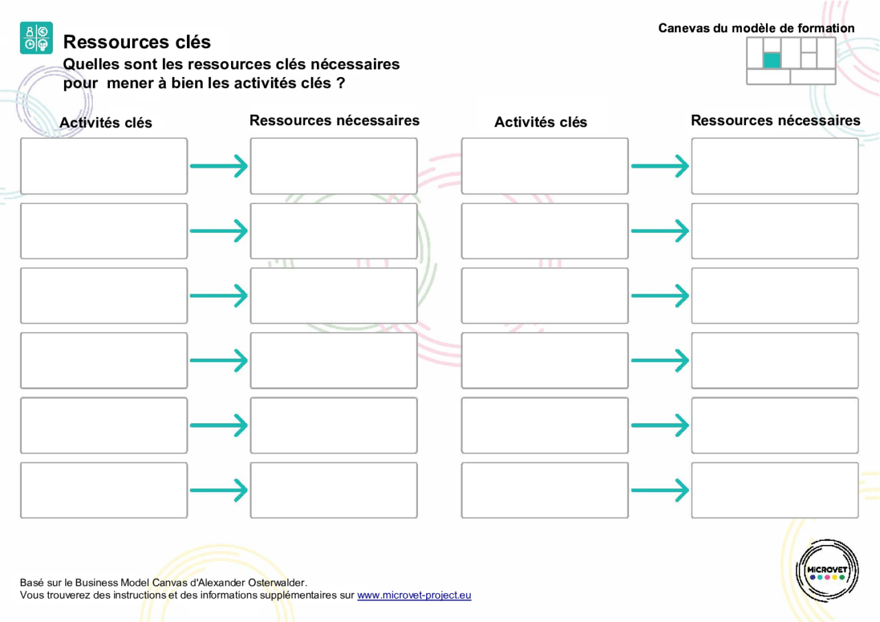 L’utilisation de la fiche de travail sur les ressources clés conjointement avec la fiche de travail sur les activités clés fournira une vision complète à la fois de ce qui doit être fait et des ressources requises, vous aidant à proposer un cours de micro-certification de qualité.