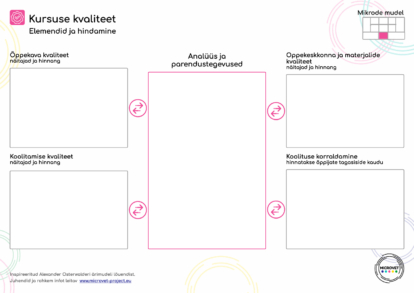 Mikrokvalifikatsiooni kursuste kvaliteet on oluline osa kursuse väärtuspakkumisest. Kvaliteedi erinevad aspektid mõjutavad ka planeeritavaid ressursse, kulusid ja oodatavat kasu. See tööleht aitab sul läbi mõelda kursuse kvaliteediga seotud tegurid ning nende seosed mudeli teiste osadega.