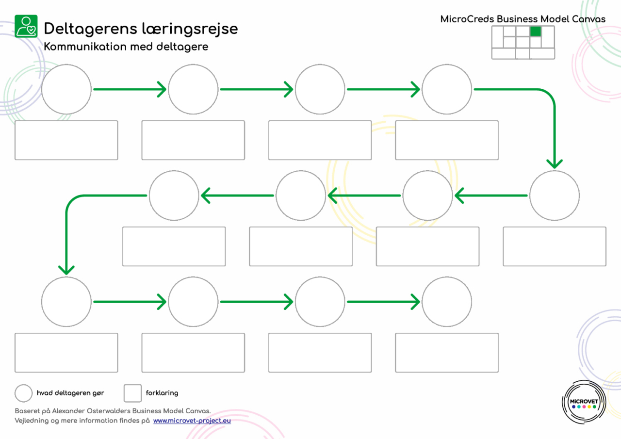 Dette arbejdsark hjælper dig med at kortlægge deltagerens læringsrejse fra første kendskab til kurset frem til kursusafslutning. Formålet er at identificere både deltagerens handlinger og kursusudbyderens understøttende aktiviteter, så hver deltager får en sammenhængende og god læringsoplevelse.