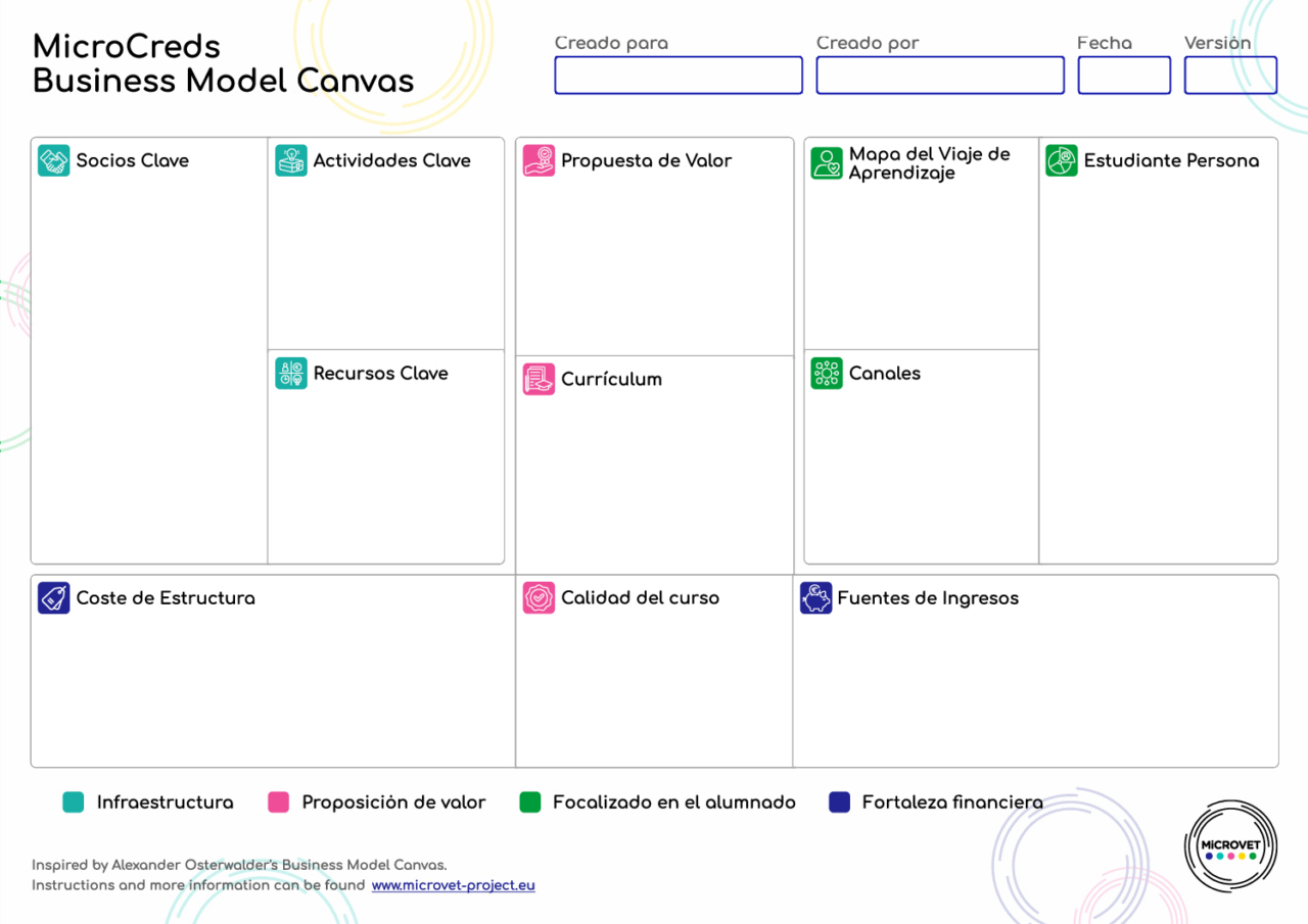 El MicroCreds Business Model Canvas (MBMC) es una adaptación del Business Model Canvas (BMC), diseñado para ayudar a los educadores y desarrolladores de cursos a crear cursos de microcredenciales centrados en el alumno, relevantes para el mercado laboral y financieramente sostenibles. El MBMC mantiene la estructura del BMC, pero cambia su enfoque hacia la formación profesional, haciendo hincapié en las necesidades de los alumnos y creando programas educativos sostenibles y relevantes para el mercado laboral.