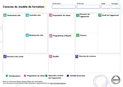 Le MicroCreds Business Model Canvas (MBMC) est une adaptation du Business Model Canvas (BMC), conçu pour aider les éducateurs et les développeurs de cours à créer des cours de micro-certifications centrés sur l’apprenant, pertinents pour le marché du travail et financièrement durables. Le MBMC conserve la structure du BMC mais se concentre sur l’éducation professionnelle en mettant l’accent sur les besoins des apprenants et en créant des programmes éducatifs durables et pertinents pour le marché du travail.