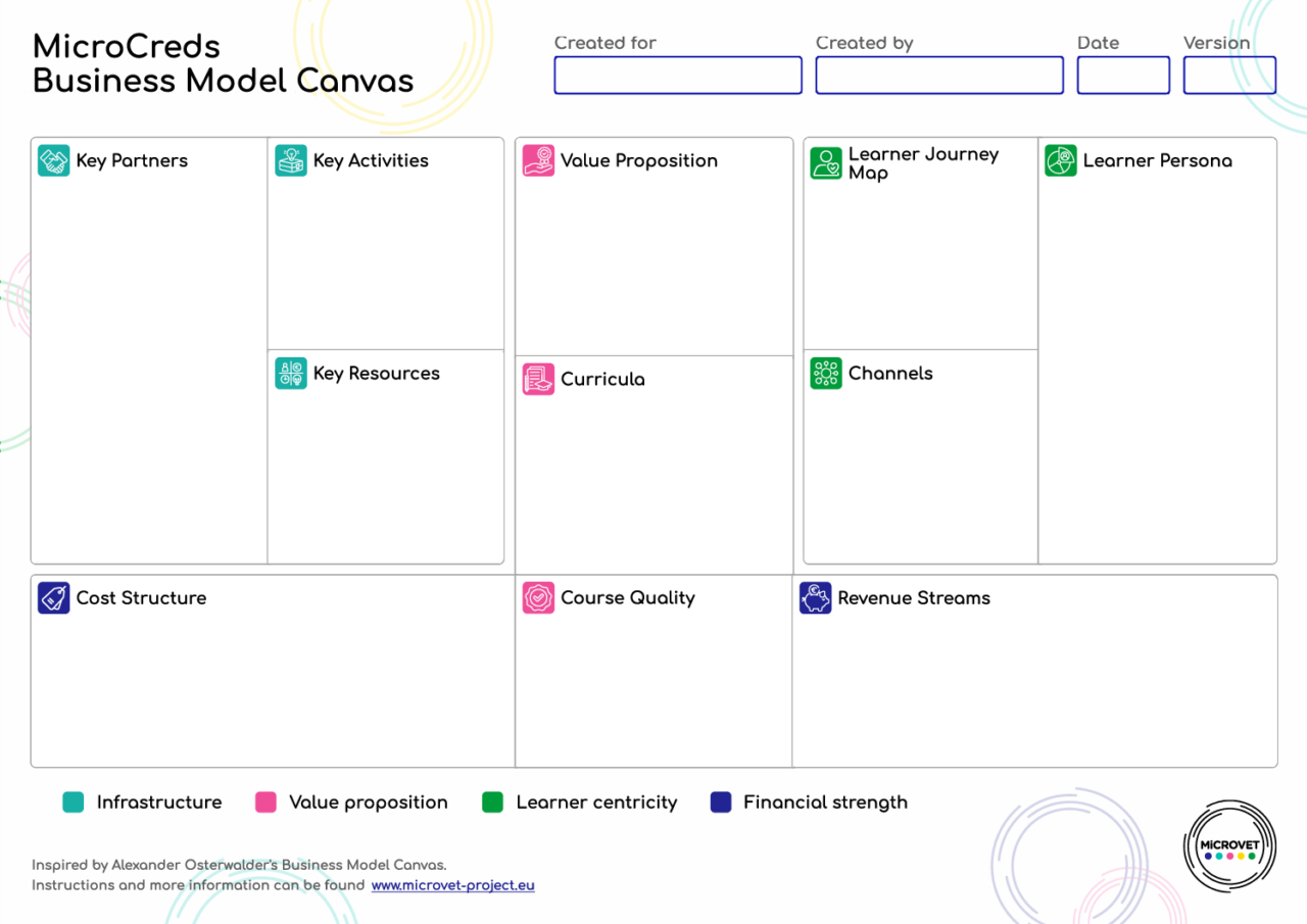 The MicroCreds Business Model Canvas (MBMC) is an adaptation of the Business Model Canvas (BMC), designed to help educators and course developers create learner-centric, labour market-relevant, and financially sustainable microcredential courses. The MBMC maintains the structure of the BMC but shifts its focus to vocational education by emphasising the needs of learners, and creating sustainable, labour market-relevant educational programs.