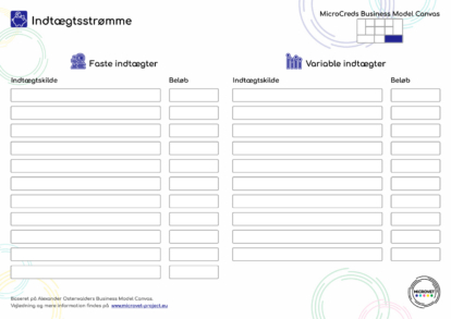 Dette arbejdsark hjælper dig med at organisere og planlægge indtægtskilderne for dit micro-credential-kursus. Ved at opdele indtægterne i faste og variable kategorier opnår du et klart overblik over kursets økonomiske potentiale. Brug arbejdsarket sammen med arbejdsarket for omkostningsstruktur for at sammenholde indtægter og udgifter og vurdere den samlede rentabilitet.