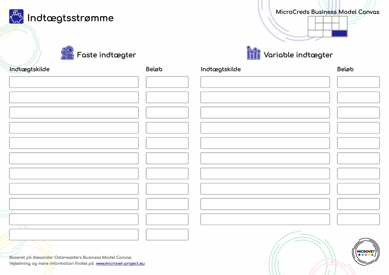 List faste og variable indtægter sammen med forventede beløb: