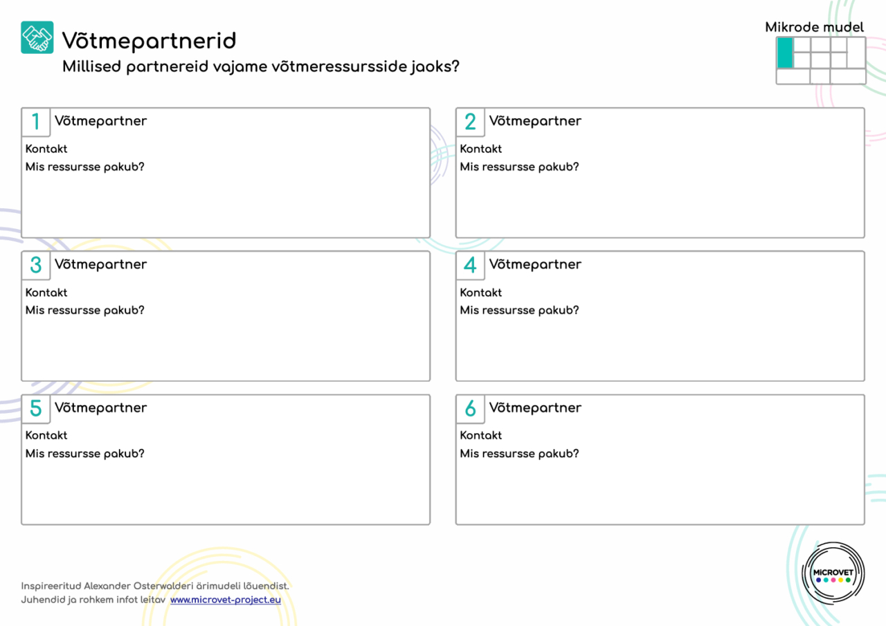 See tööleht on loodud selleks, et kaardistada ja korraldada kõik olulised partnerlussuhted, mis on vajalikud sinu mikrokvalifikatsiooni kursuse edukaks läbiviimiseks. Kui määratled partnerid ja mõistad, milliseid ressursse nad pakuvad, on sul olemas vajalik tugi kursuse eesmärkide saavutamiseks.
